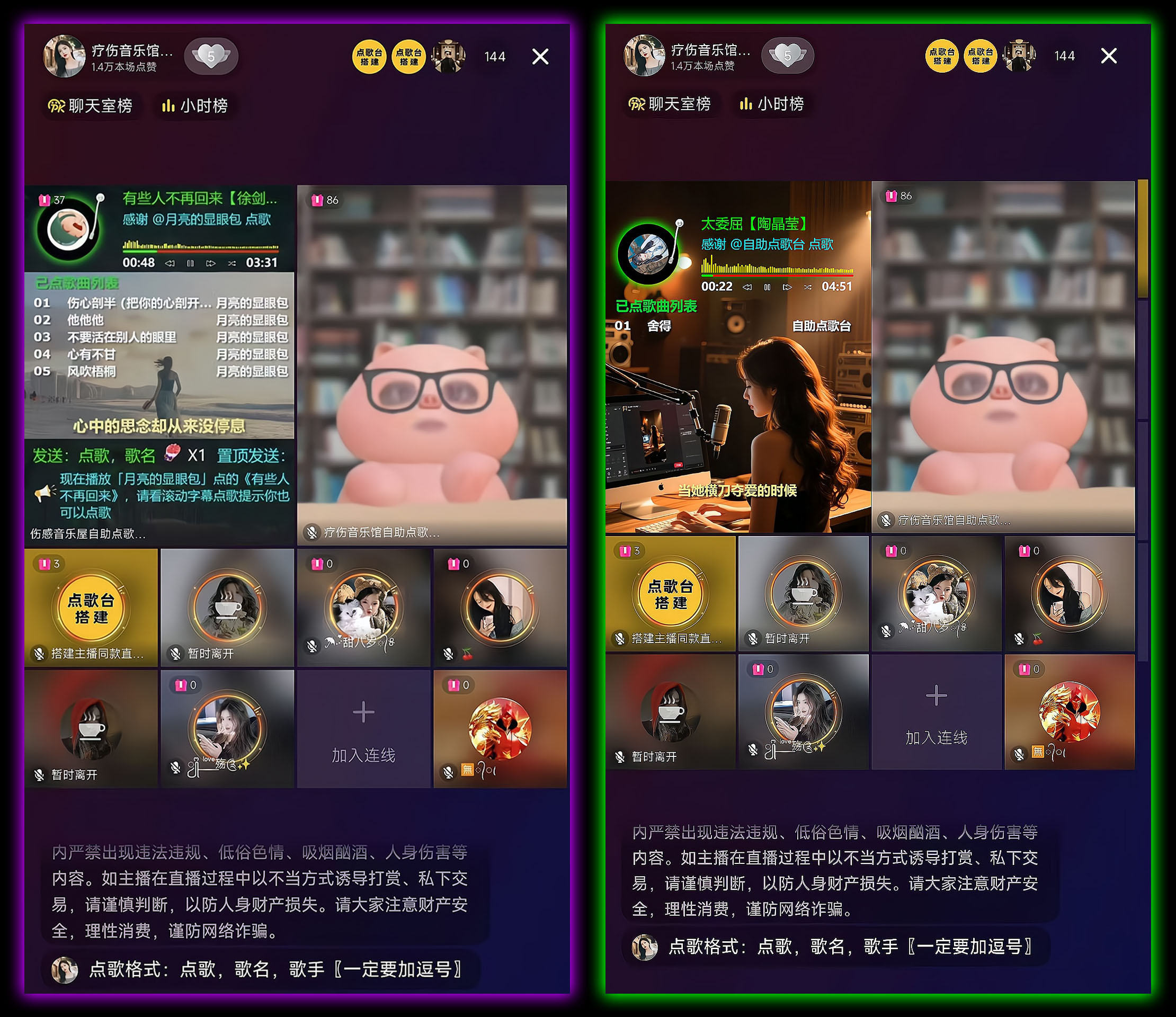 支持功能:支持礼物或者积分点歌、置顶、切歌、续听、删歌、超级切歌,支持语音播报、文字弹幕播报,支持冷场讲解、礼物感谢、关注感谢、点赞感谢、直播间进人欢迎、关键词自动回复,支持deepseek、阿里云、腾讯云等多个大语言模型智能回复,支持普通用户组、粉丝团用户组、VIP用户组、管理员用户组独立自定义积分,支持横版、竖版、七宫格、九宫格、十宫格模板布局,支持阿里云、腾讯云、百度云三大语音接口,支持几百种男生女生普通话及方言发音模型,支持刷任何礼物召唤火箭、嘉年华、天空之城、宇宙之星、璀璨花海、秘境巡游、十里桃花等绝版震撼唯美特效、支持木鱼计数、音播特效、头像飘屏、贵宾席位